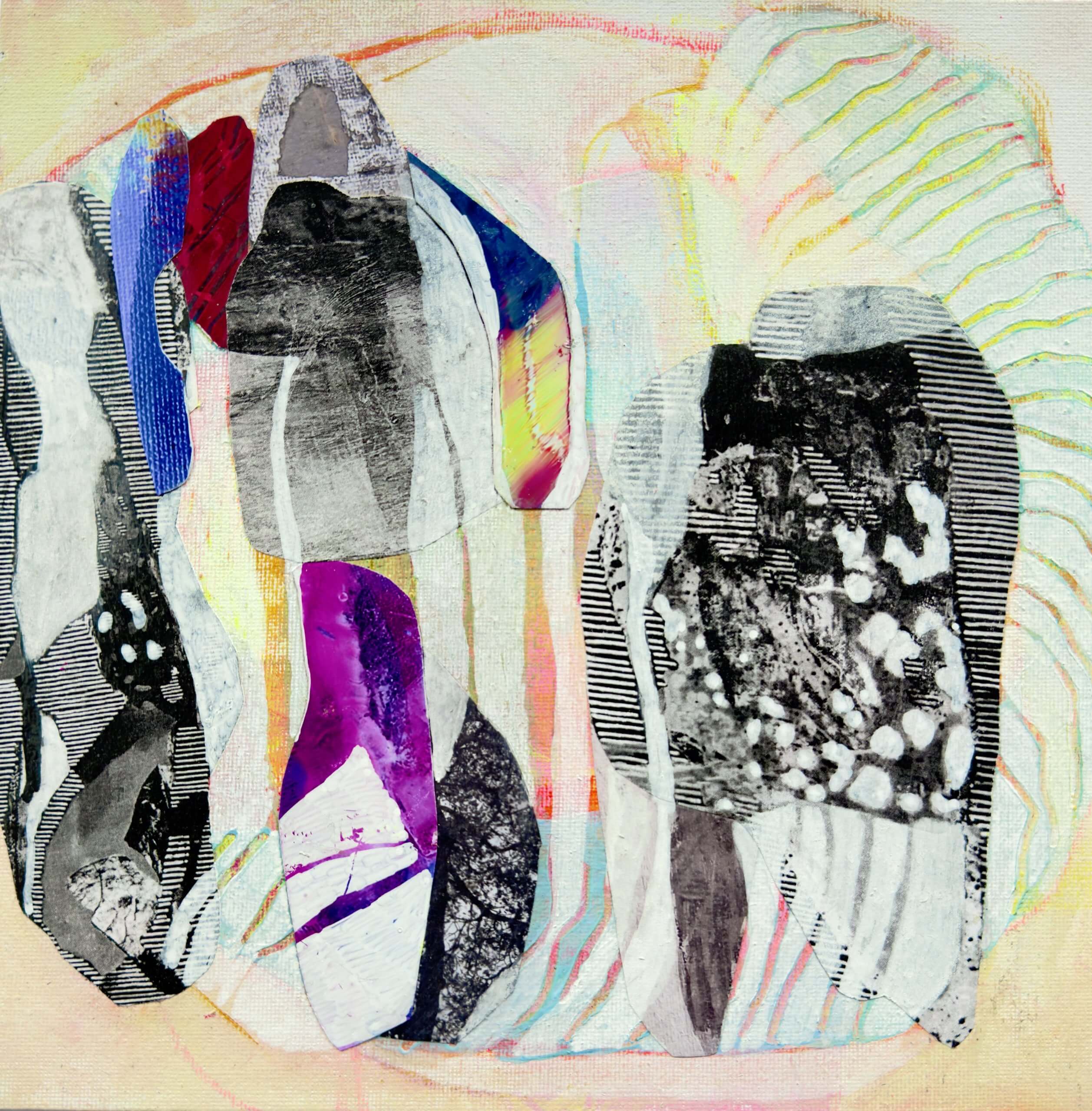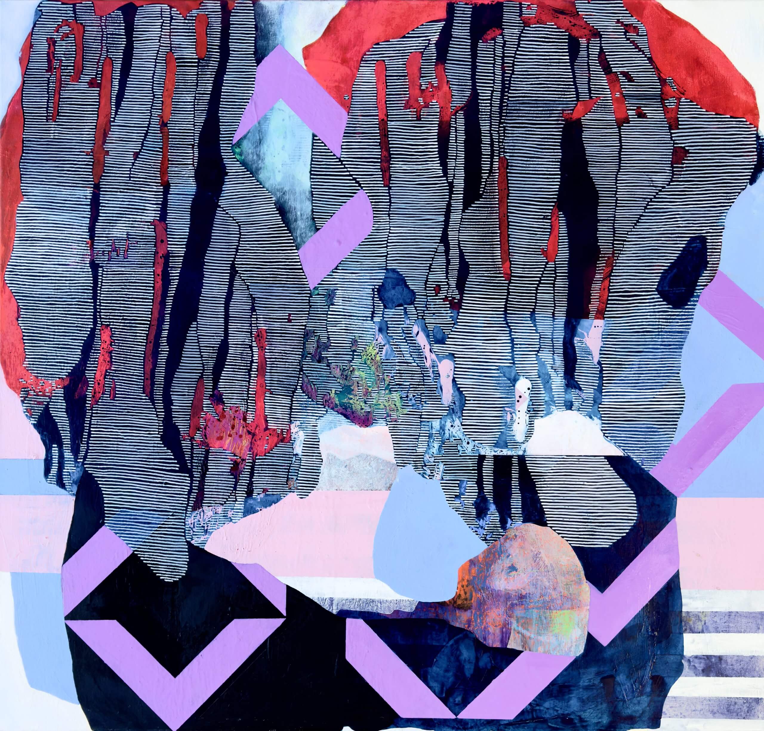 The interplay of cool lavenders and pale blues with warmer, earth-bound tones generates a dynamic equilibrium — a visual embodiment of the “third horizon” as a conceptual space where the remnants of the known meet the architecture of the not-yet. The geometry, both rigid and interrupted, evokes the diagrams of sacred architecture, yet here the “plan” is not fixed; it is in flux, responsive to an inner pulse.