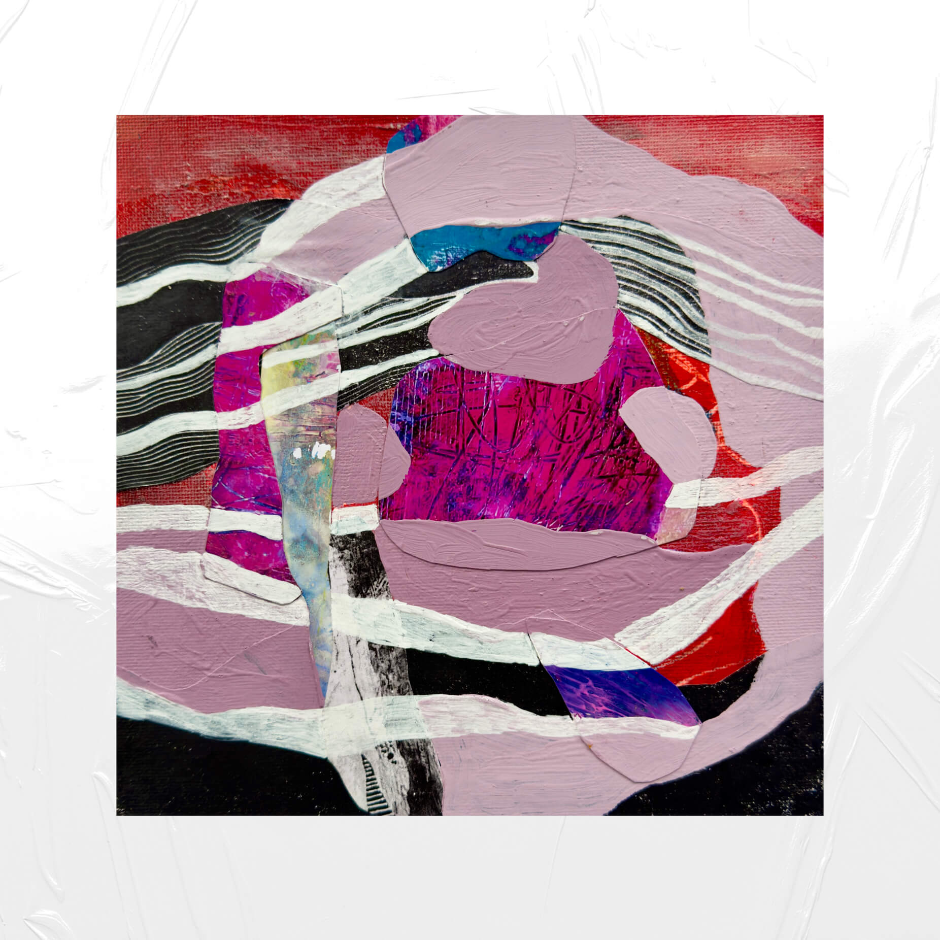 A painting opens. Onto the act of seeing. Onto a world with two inhabitants at the beginning. Those safety lines in the soft halo, the pink redemption, the paradoxical blue field-blocks of air – these are not referents, not symbols, but primal events shared between the viewer and the artist. The canvas does not depict: it works a new code for a shared new inlanguage of an inworld. This is non-referentiality: the unhooking of a sign from the known world and the redirection of it in search of a sibling, of a partner, of a kin. Such paintings refuse to denote. They innote. A generative system of strokes and textures that evoke not things, but the common capacity for evocation. A transformational landscape where deep old structures are only felt since only recently surfaced. The echo of something always-almost said and alwaysalmost understood.